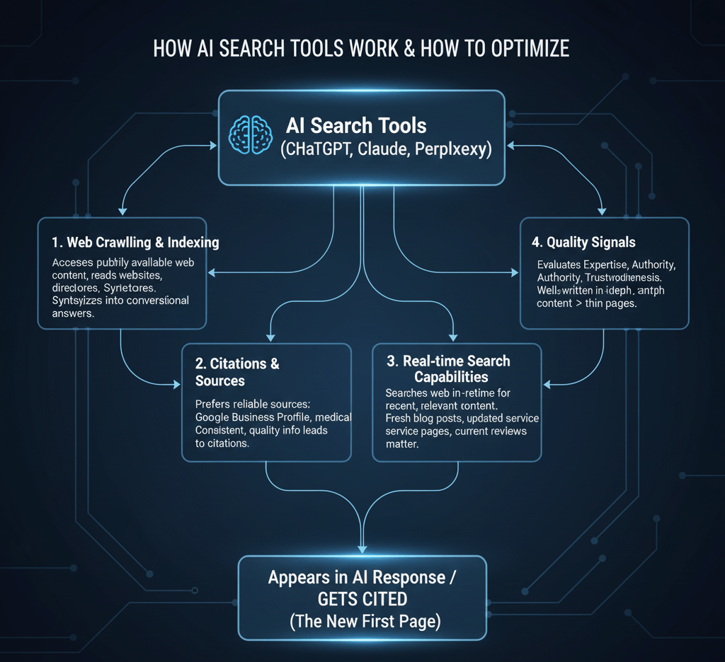 AI tools cite sources differently: Unlike Google, which ranks pages based on hundreds of factors, AI search tools pull information from sources they trust and cite them in their answers. Getting cited means your practice appears in the AI's response—which is the new first page of search results