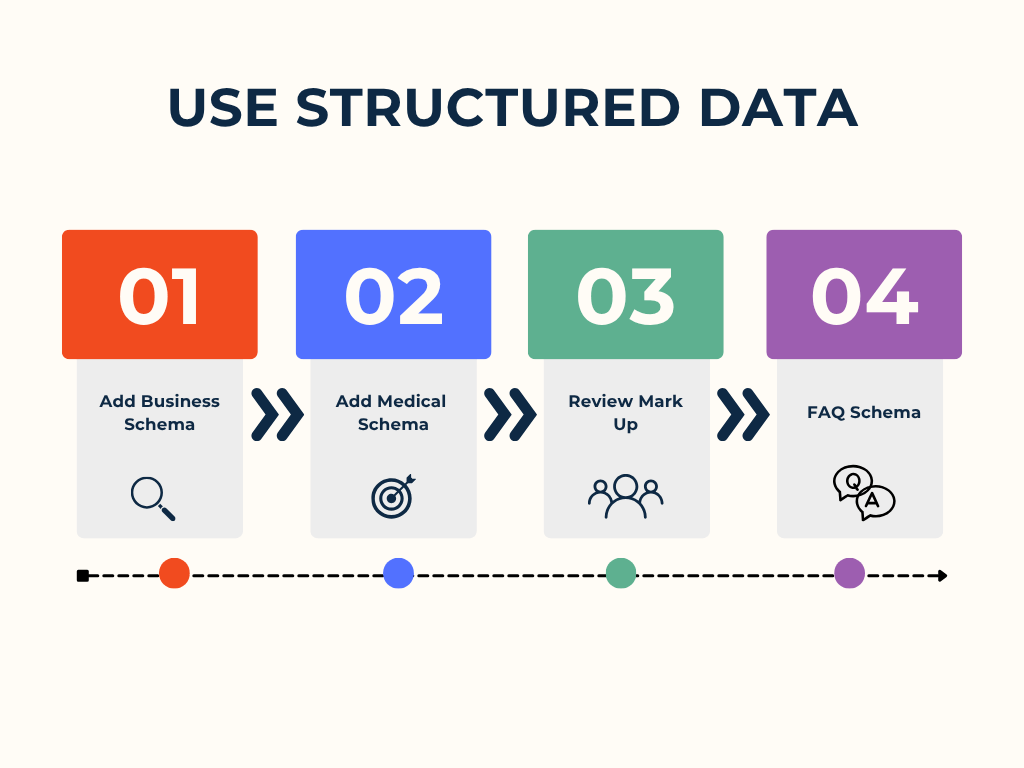 Implement local business schema: This structured data format includes your practice name, address, phone number, hours, services, and accepted insurance. It makes it crystal clear what your business is and what you offer.