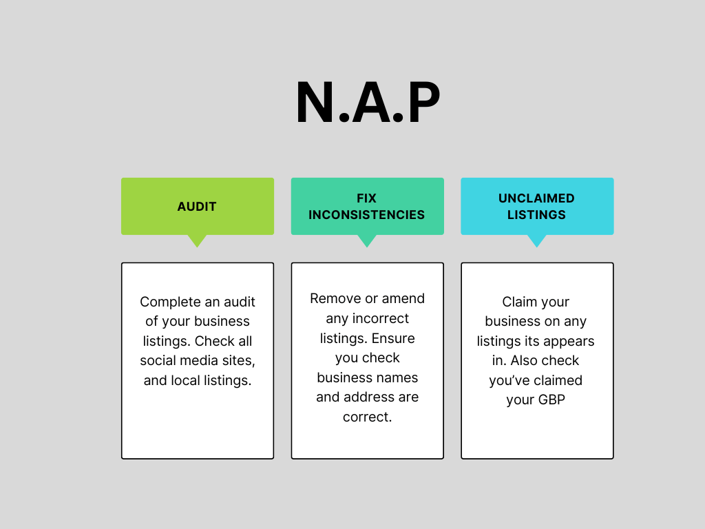 NAP stands for Name, Address, Phone number. AI tools pull information from multiple sources, and inconsistencies confuse them.