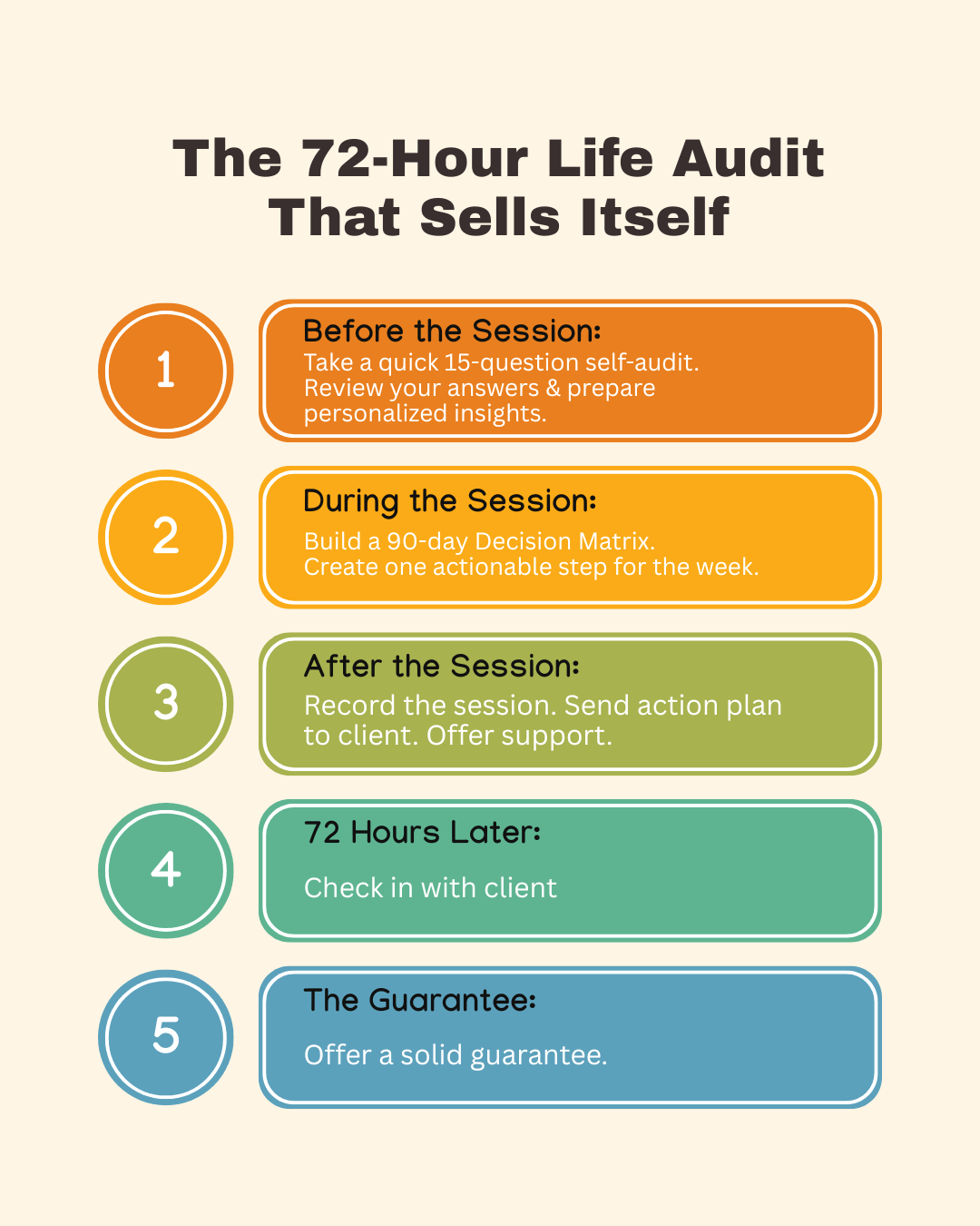 After someone finishes your full coaching program (not the $197 audit—your main package), offer this: "I'll give three of your friends a free 72-Hour Life Audit. You pick who gets it. All they need to do is mention you sent them."